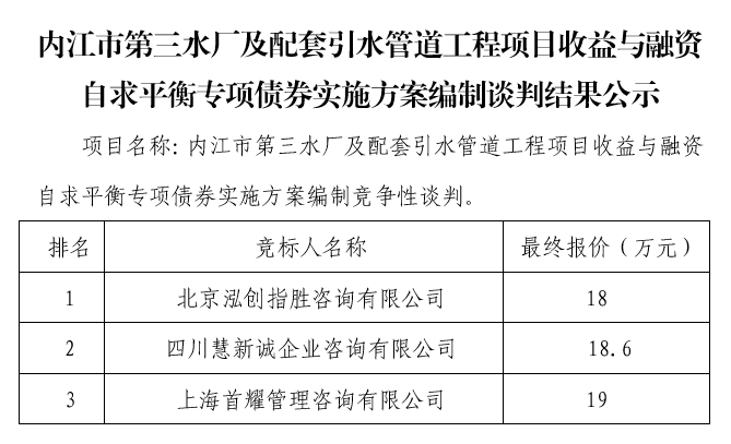 內(nèi)江市第三水廠及配套引水管道工程項(xiàng)目收益與融資自求平衡專(zhuān)項(xiàng)債券實(shí)施方案編制談判結(jié)果公示