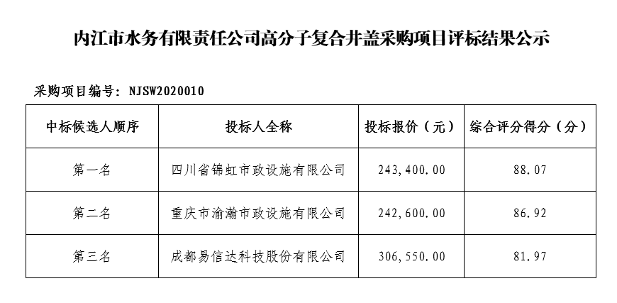 內江市水務有限責任公司高分子復合井蓋采購項目評標結果公示