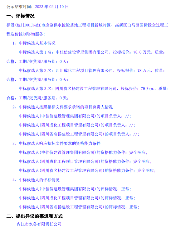 內江市應急供水搶險基地工程項目新城片區、高新區白馬園區標段全過程工程造價控制咨詢服務中標候選人公示