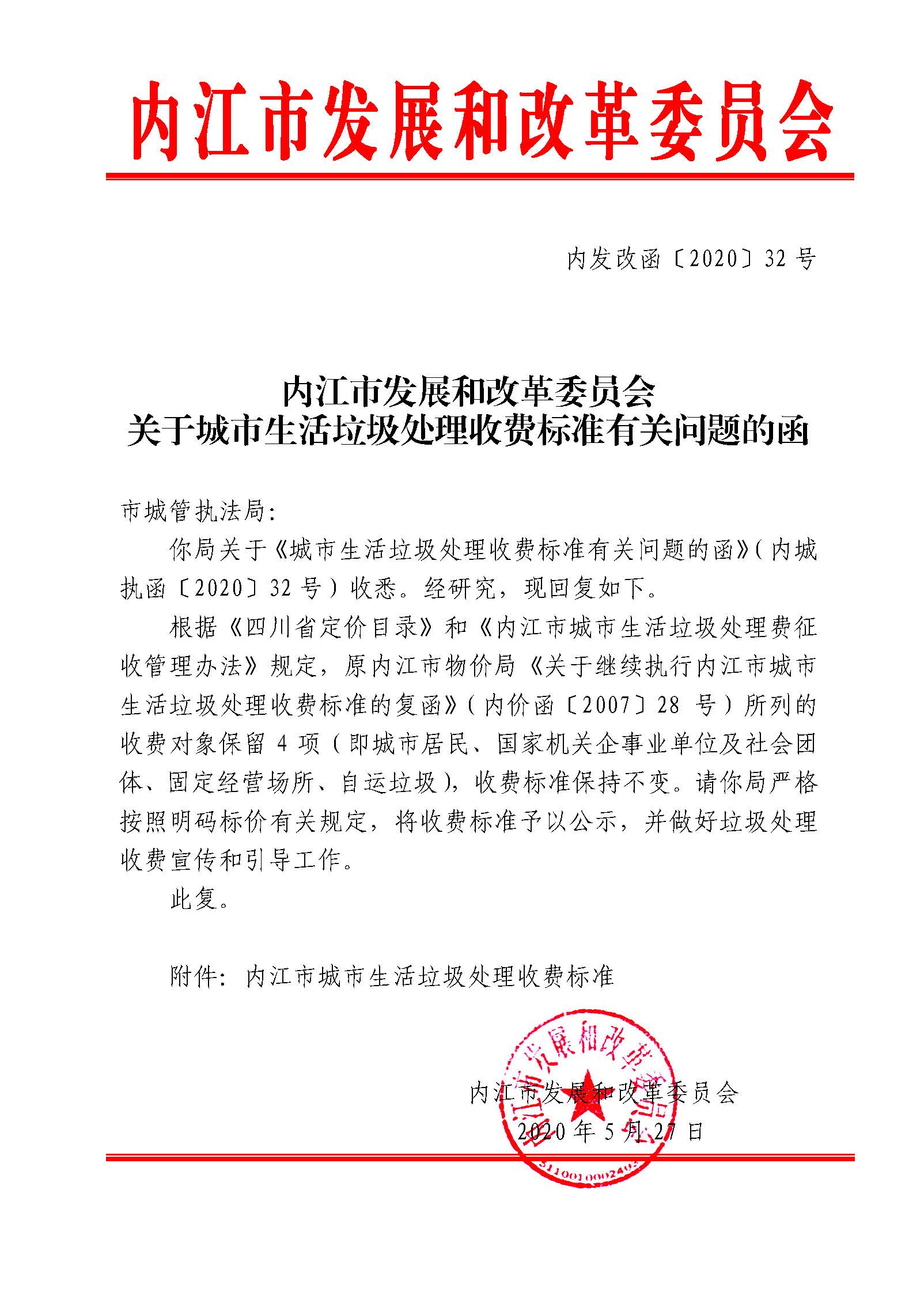 內江市發展和改革委員會關于城市生活垃圾處理收費標準有關問題的函