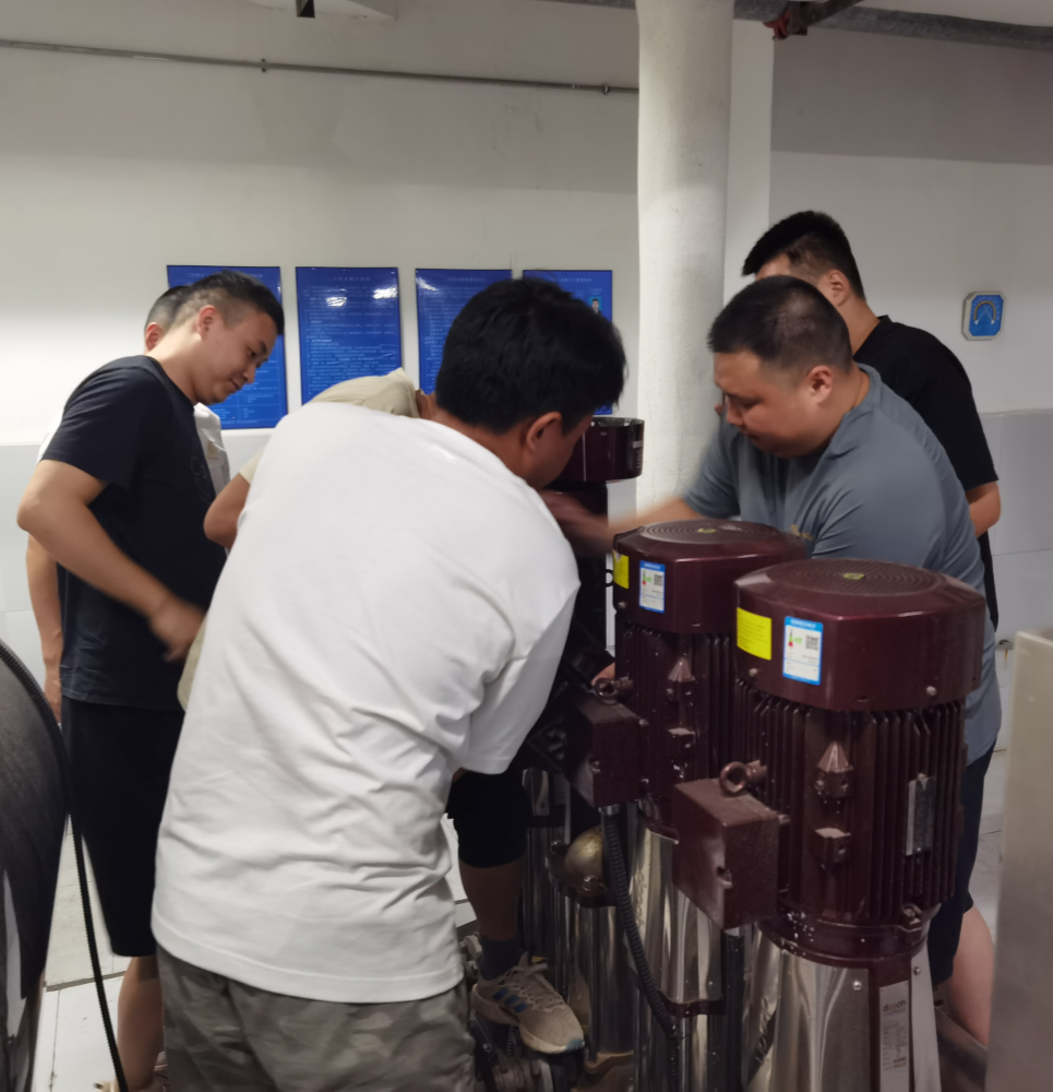 6月中旬,該小區(qū)有用戶反映水壓不穩(wěn)定。豪鵬二次供水公司收到信息立即組織人員前往現(xiàn)場(chǎng)排查,確認(rèn)是一臺(tái)水泵電機(jī)出了故障,引發(fā)電壓波動(dòng)所致。面對(duì)突發(fā)情況,公司迅速響應(yīng),立即組織人員對(duì)故障電機(jī)進(jìn)行拆解維修。6月17日下午,維修工作進(jìn)入電機(jī)重新安裝的關(guān)鍵階段,公司抓住這次實(shí)戰(zhàn)機(jī)會(huì),組織5名青年員工參與到此次技術(shù)練兵。通過(guò)此次培訓(xùn),員工們不僅掌握了電機(jī)維修與安裝的相關(guān)理論和維護(hù)技巧,更在實(shí)戰(zhàn)中深化了對(duì)二次供水設(shè)施運(yùn)行原理的理解。