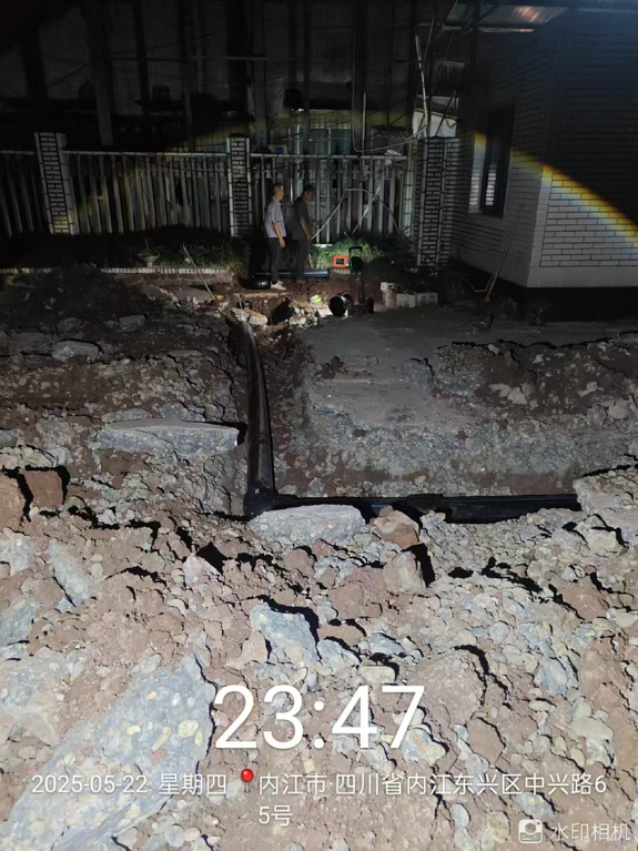 5月22日下午,市水務公司管網運行部接到緊急報修電話,東興區政府DN150鋼管突發爆裂,直接影響東興區政府、東興初中、十三小、大淵龍居等區域的居民用水。維修組和探漏組迅速組織人員趕赴現場。確認漏點位置后,維修工作陷入困境,因漏點位于東興區政府門衛室下方,無法展開維修。分管領導黃勇得知情況后,親臨現場指導,與部門負責人張羽、雷鳴商討后制定了改管方案,并現場指揮維修工作有序進行。