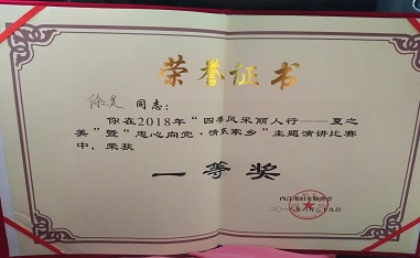 在內(nèi)江婦聯(lián)組織的2018年“四季風(fēng)采麗人行—夏之美”暨“忠心向黨.清溪家鄉(xiāng)”主題演講比賽中,我司推薦的選手徐昊代表國(guó)資委參賽,獲得一等獎(jiǎng)。
